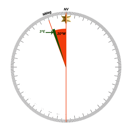 Sendo o Desvio da Agulha (Dag) = 3ºE e a Declinação magnética (DecMag) 20ºW, então a Variação Total (VT) será: